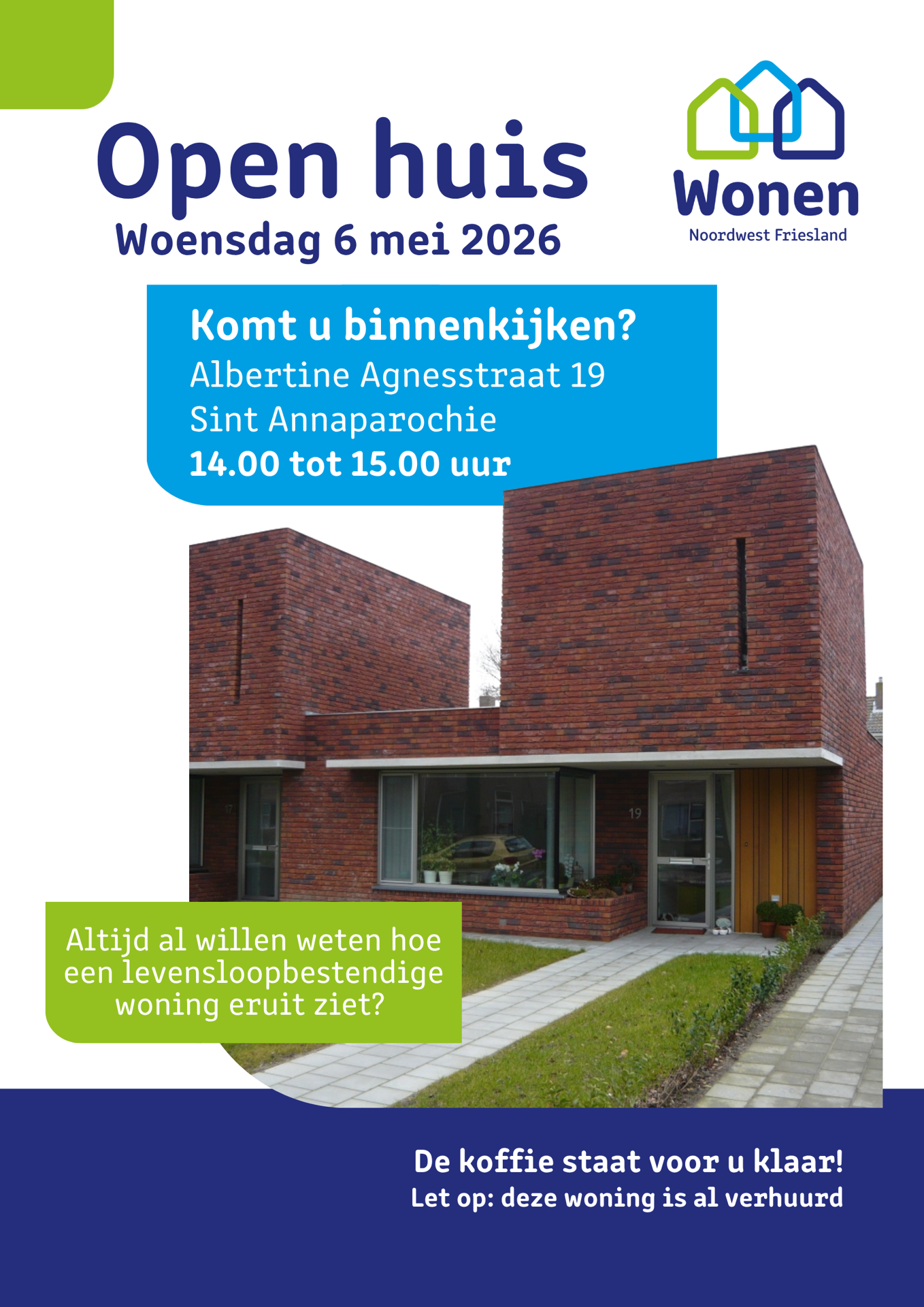 Op woensdag 6 mei bent u van harte welkom om eens binnen te kijken bij de Albertine Agnesstraat 19 in Sint Annaparochie. Het Open Huis is van 14.00 tot 15.00 uur.